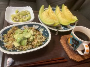 電車で帰ってメロンとキウイと塩昆布キャベツアボカドサラダで緑一色ご飯。