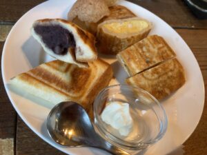 厚焼き玉子とあんバタ(マスカルポーネクリーム添え)のハーフ&ハーフ ホットサンド。