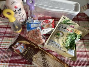 KALDIで安売りになってたのを買っておいたスパゲッティと、ネギ、鰹節、味の素、バター、醤油に胡椒少々。