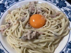 パスタ100gにお茶漬け海苔とシーチキン、マヨネーズ適量でまぜまぜ。生卵乗せたら出来上がり。