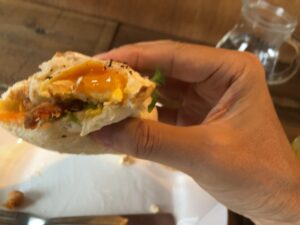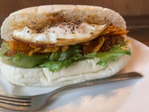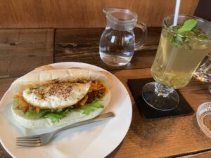 メニュー、サツマイモとカボチャのグラタンドッグとも悩んだけど鯖のタコス(目玉焼き付き)に決定。