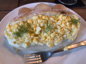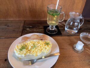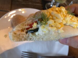 ミモザの黄色を卵で表現しましたってことなんだけど、これが食べるの難しい。
