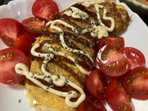 千切りキャベツ200gを卵2個で丸くやいて半分に折って粉無しお好み焼き。