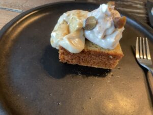 ホットミントライムにマロンティラミスケーキ(グルテンフリーのアーモンドパウンドケーキにマロンクリーム入りのティラミスクリームを添えています)を頂く。