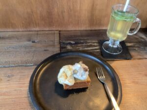ホットミントライムにマロンティラミスケーキ(グルテンフリーのアーモンドパウンドケーキにマロンクリーム入りのティラミスクリームを添えています)を頂く。