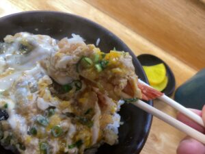 天玉丼は天丼の上にお出汁で緩めた卵をかけるだけなのだけど、この半熟加減が絶妙。