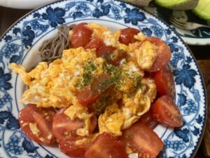 トマ玉炒め 中華風甘酢餡をお蕎麦に乗っけてみました。