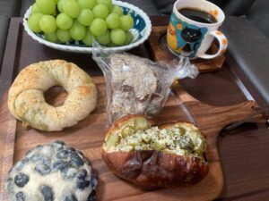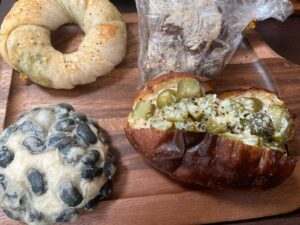 バジルリングと黒豆パンとツナ・ピクルスドッグと胡桃とぶどうのカンパーニュハーフで1290円。