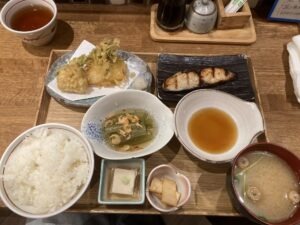 いちょう定食でメインは鰆の幽庵焼きに春野菜天ぷら3種のツートップ。