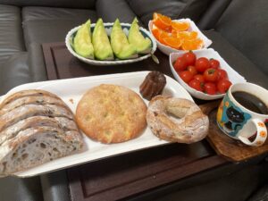 オリーブのカンパーニュと甘めのシュクレとナッツいっぱい入ったドーナツみたいだけど甘くないやつとカヌレ。