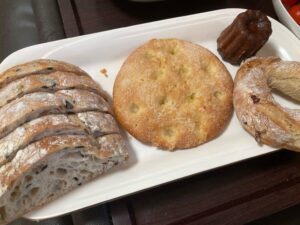 オリーブのカンパーニュと甘めのシュクレとナッツいっぱい入ったドーナツみたいだけど甘くないやつとカヌレ。