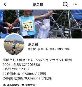 「そう、ぼくの同期の内科医にウルトラマラソンやってみたら、才能がありそうなんでマジでやってみるって医者辞めた奴がいるんだよ。ま、最近は膝壊して医者に戻ったみたいなんだけどね。知ってる?原君?」