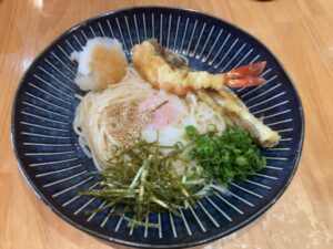 五島うどんのスペシャルぶっかけ、牛肉抜き、半熟玉子天、まだできてないそうなので温玉変更。