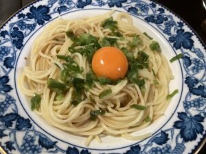 レンジで茹でて茹で汁捨てたらオリーブオイル絡めて、冷凍ネギと卵の黄身、美味しい醤油で出来上がり。