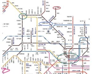 左下のお家からはまず右下の梅田駅か左上の宝塚駅に行く必要があります。