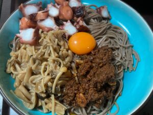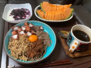 日本そばにサバラー油だのなめ茸だの🐙だのトッピング。