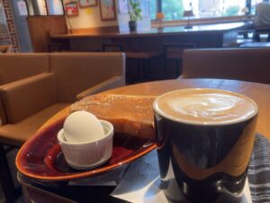 月替わりモーニングの胡桃バタートーストとホットラテ。読書しながらいただく。